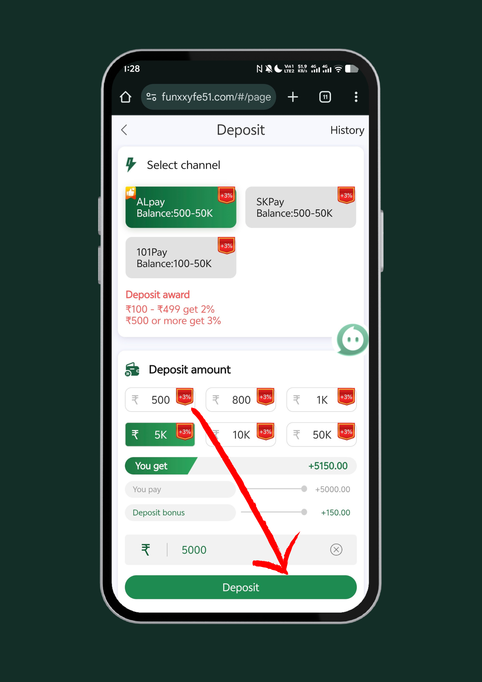 Click on deposit button and choose your preferred payment method